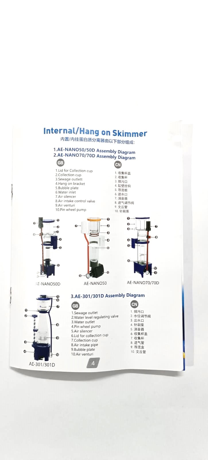 The Aqua Excel AE-NANO50D protein skimmer is designed for smaller marine aquariums, specifically those up to 120 liters (32 gallons). It utilizes a needle-wheel impeller and is powered by an energy-efficient Sicce Micra pump. The skimmer is designed to be easily installed in the sump and has a small footprint, making it suitable for nano systems.